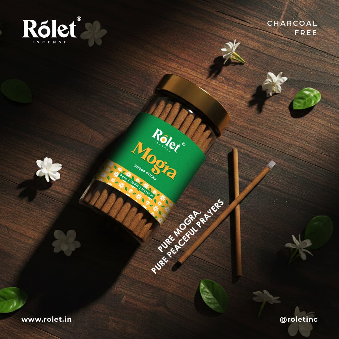 Experience the divine and enchanting aroma of fresh Jasmine with our Mogra Dhoop Sticks. Specially crafted for spiritual and aromatic use, these bamboo-less dhoop sticks offer a pure, soot-free burn that transforms any space into a sanctuary of peace. Ideal for daily pooja, meditation, yoga, or as a natural room freshener.