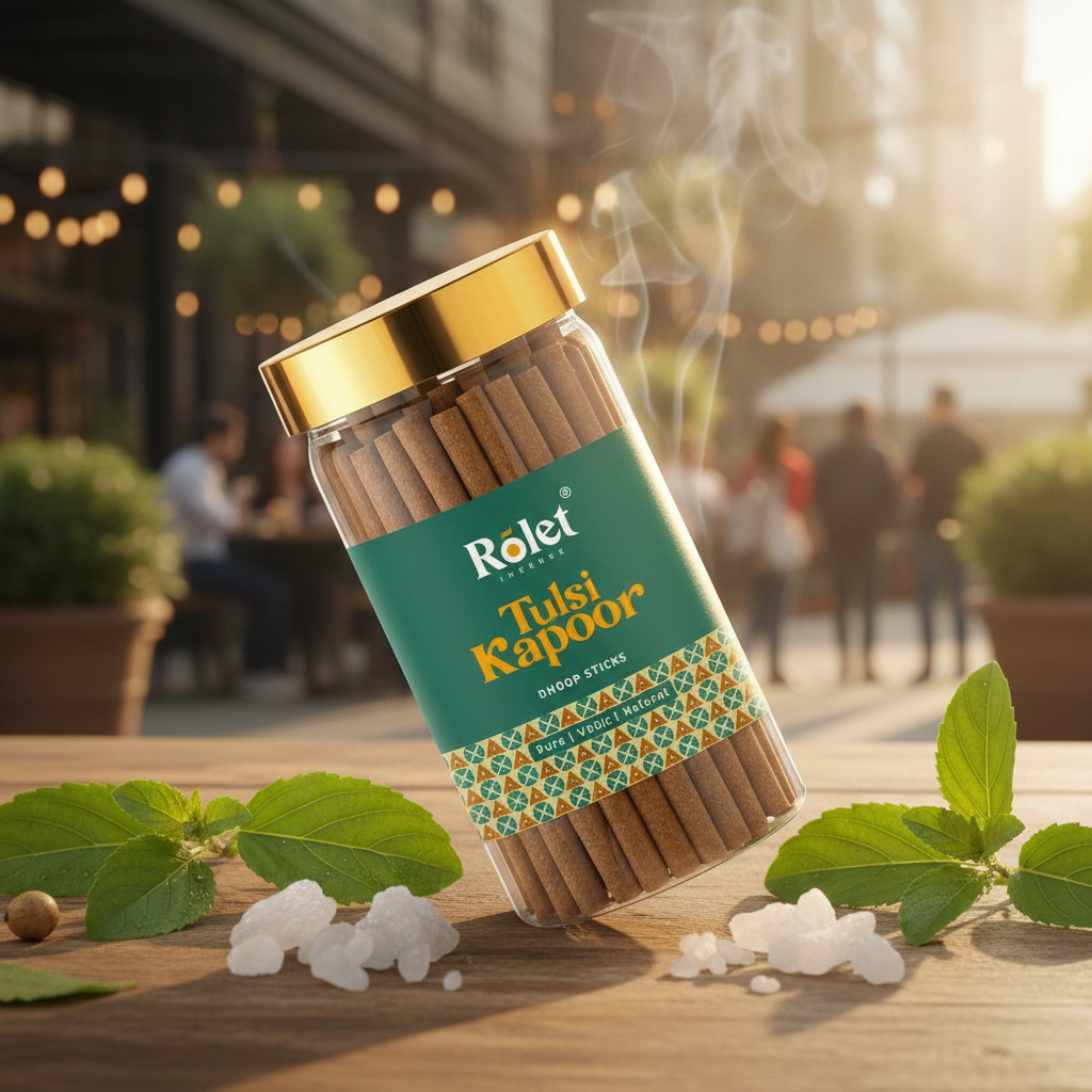 Rolet Tulsi Kapoor Dhoop Sticks,These dhoop sticks are meticulously crafted using a blend of Pure Tulsi (Holy Basil) and Kapoor (Camphor) to create a sacred and refreshing ambiance. Designed to be 100% Bambooless and Charcoal-Free, they provide a cleaner, non-toxic burn that is ideal for daily puja, meditation, and aromatherapy.